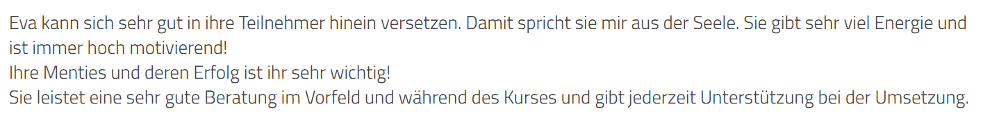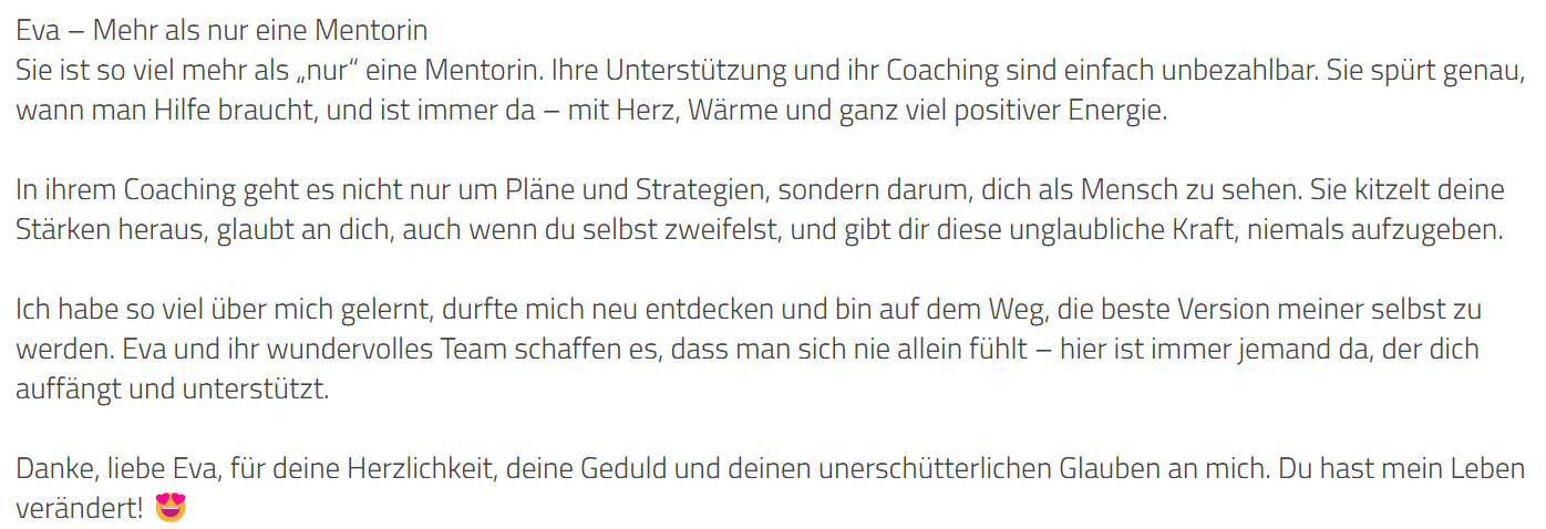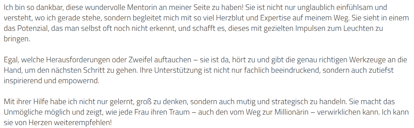 Also habe ich mich einer Coachin anvertraut und Schritt für Schritt gelernt, wie ich mein Online-Business aufbauen kann. Von A bis Z! Wie, was, wann und warum gemacht werden muss, damit ein solides, nachhaltiges und umsatzstarkes Business entsteht. Das war für mich der GAME CHANGER! Innerhalb von 12 Monaten hatte ich ein laufendes Online-Business (mein Herzens-Business🫶) und bereits im 1. Jahr mehr als 100.000 Euro Umsatz gemacht.